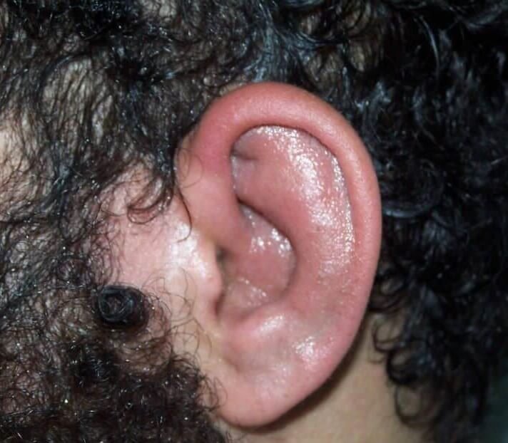 A condricte auricular, que pode ser unilateral ou mais frequentemente bilateral, é a manifestação clínica mais comum da PR, observada em até 90% dos casos . Em 20% deles é o sintoma inicial. O início é súbito com dor, inchaço e vermelhidão doloroso e edema localizado na parte cartilaginosa da orelha, poupando o lobo. A perda auditiva, a qual pode ser condutiva ou neurossensorial, foi encontrada em até 46% dos pacientes.